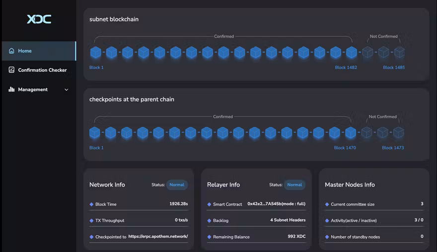 - Relayer service that anchors subnet state to the XDC mainnet through the checkpoint smart contract
