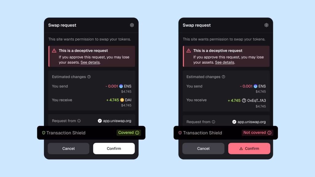 Transaction Shield builds upon MetaMask’s existing security stack, which already includes automated transaction simulations and contract safety checks. When you subscribe to the service, you receive clear in-app alerts showing which transactions qualify for protection. The system only covers transactions that MetaMask has deemed safe through its security checks.
